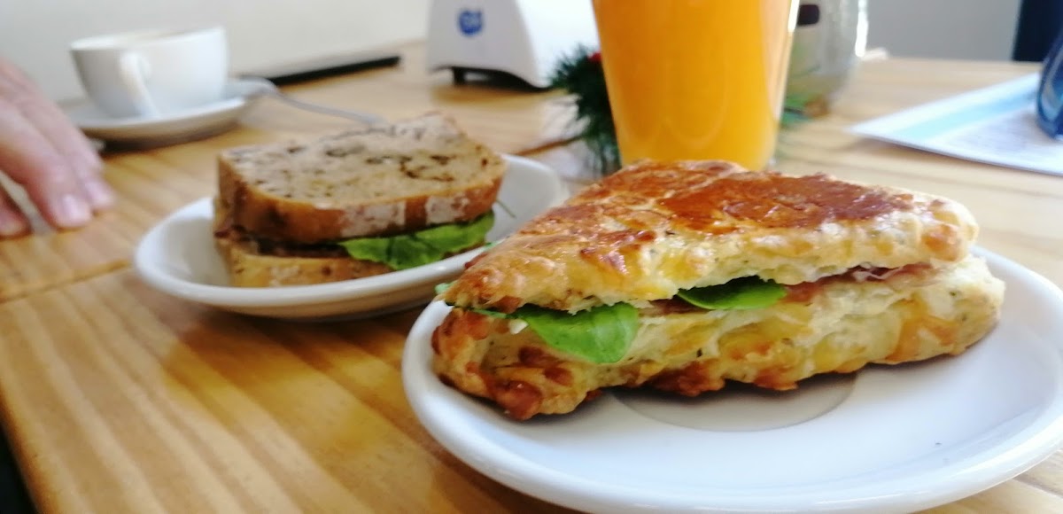Pan de masa madre, jamón, muzarella, huevo y queso crema.